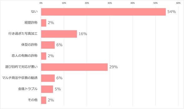マッチングアプリで嫌な思いをしたことがあるか聞いたところ、最多の回答は「ない」(54%)だった。次いで、「遊び目的で対応が悪い」(29%)、「行き過ぎた写真加工」(16%)という結果に。