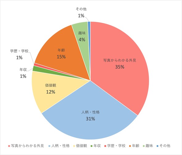 相手を選ぶときに重視していることは、1位が「写真から分かる外見 」(35%)で、2位が「人柄・性格」(31%)、3位が「年齢」(15%)だった。「学歴・学校」や「年収」は1%という結果に。