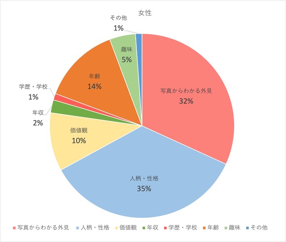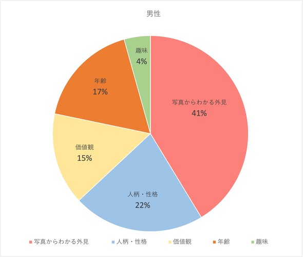 男女別に分析すると、女性は1位が「人柄・性格」(35%)で、2位が「写真から分かる外見」(32%)だった。一方、男性は1位が「写真から分かる外見」(41%)で、2位が「人柄・性格」(22%)だった。