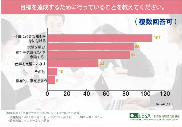 最後に「目標を達成するために行っていること」を聞いた。資格の勉強や読書など「仕事に必要な知識を身に付ける」(107人)が最も多く、次いで「実績を積む」(88人)、「相手を気遣うことを意識する」(84人)と続いた。