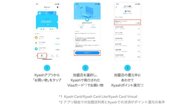 同サービスは、アプリを経由し、Kyashで発行されたVisaカードを使いKyashリワード対象加盟店で買い物をすると、通常のポイント還元に加え、加盟店の還元率に合わせてKyashポイントを付与する。総合通販サイトや有名ブランドECサイトなど約50の加盟店に対応しており、今後拡大を予定している。