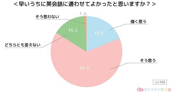 最後に未就学児を早いうちに英会話教室に通わせてよかったと思うか聞いた。「そう思う」が65人、「強く思う」が19人で、通わせて良かったと考える親は全体の84%だった。通わせてよかったと感じている人からは、「発音がいいから」という意見が多く聞かれた。