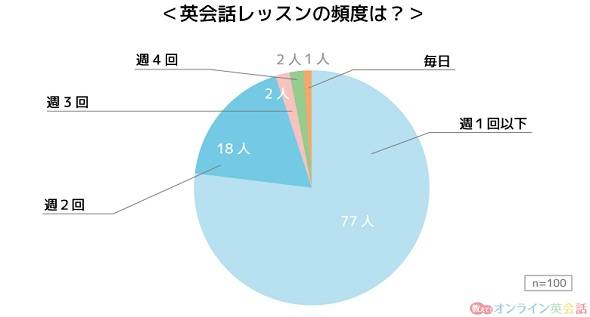 英会話教室の1カ月のレッスン費用はどれくらいかの問いに、最も多かったのは「5000円以上1万円未満」(41人)、次いで「1000円以上5000円未満」(35人)、「1万円以上5万円未満」(24人)だった。英会話レッスンを受講する頻度は、77人が「週1回以下」と回答した。同社は「週1回のレッスン(月4回)で、レッスン費用は5000〜1万円が相場と考えられる」とコメントした。
