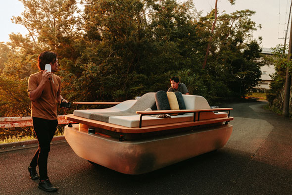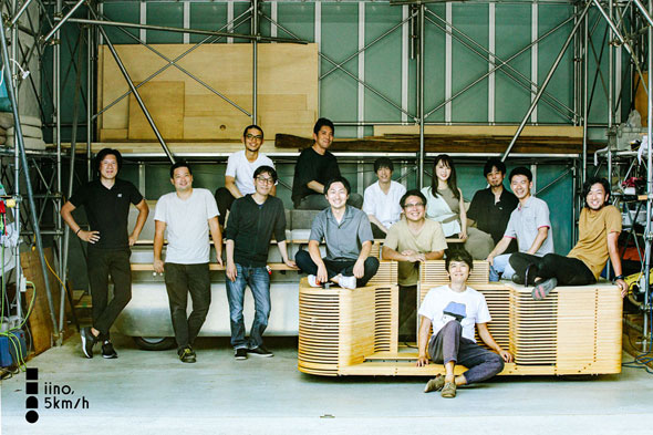 メンバーが着目したのは、ターレットだ。動力部が円筒になっていて、360度回転するアレである。市場などで荷物を運ぶために、キビキビと動いている姿を見たことがある人も多いだろう。ターレットの構造をベースに、荷台のところに人が乗れるようにしたり、寝転ぶことができるようにしたり、最大5人まで乗車できるようにしたり。さまざまなことに取り組んでいる中で、筆者が気になったのは2月に実施した「実証実験」(2月2〜11日)である。