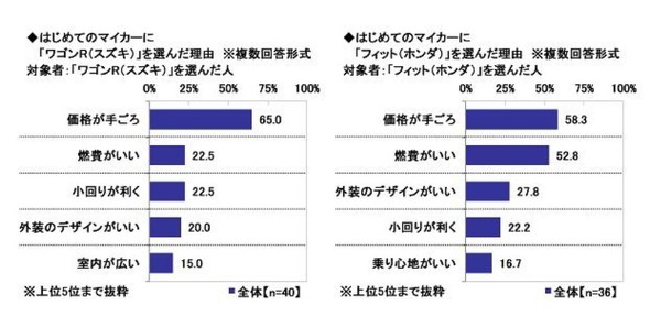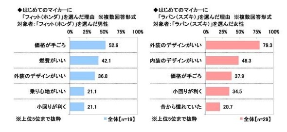 初めてのマイカーを選んだ理由を尋ねた。すると、1位が「外装のデザインがいい」(43.2%)、2位「価格が手ごろ」(40.1%)、3位「燃費がいい」(31.3%)だった。