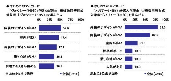 「ヴォクシー」は、「内装のデザインがいい」(52.6%)、「ハリアー」は「外装のデザインがいい」(62.5%)がそれぞれ最多となった。