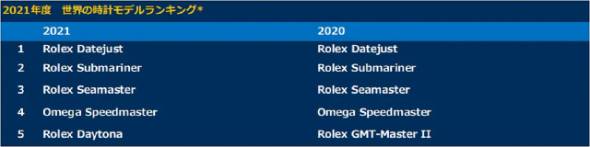 世界の時計モデルランキングでは、昨年度に続き1位にRolexのDatejust、2位にRolexのSubmarinerがランクインした。また21年度ではDaytona(デイトナ)がシェアを上げ5位にランクインした。