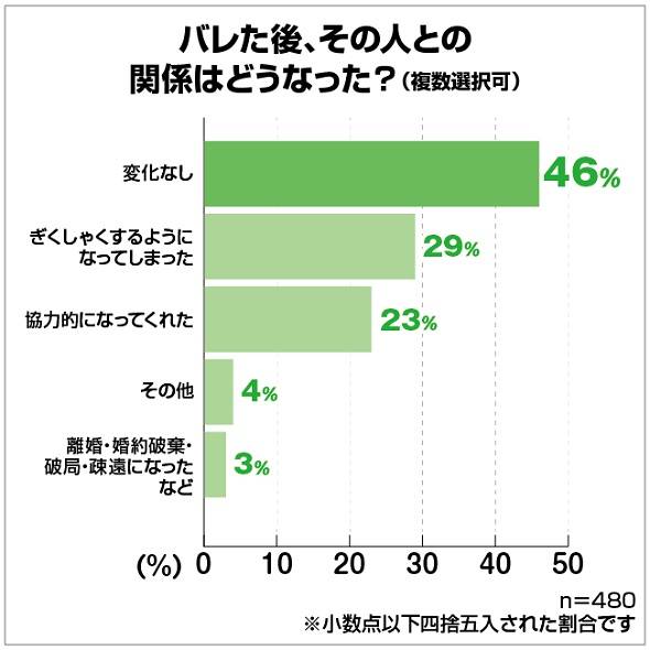 バレた後、その人との関係はどうなったのか聞いた。最も多かったのは「変化なし」(46%)で、「ぎくしゃくするようになってしまった」(29%)、「協力的になってくれた」(23%)と続いた。