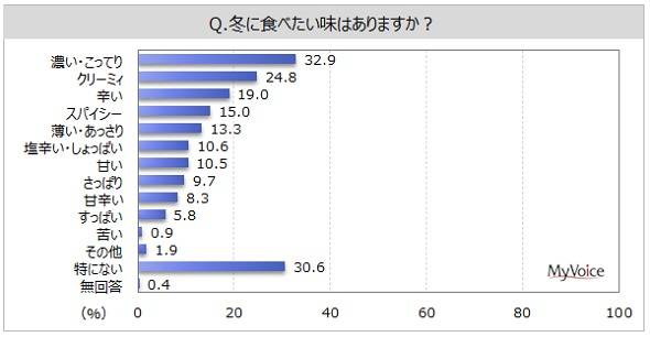 冬に食べたい味を聞いたところ、1位は「濃い・こってり」で32.9%、2位は「クリーミィ」で24.8%、3位は「からい」で19.0%だった。「クリーミィ」は女性で比率が高かった。