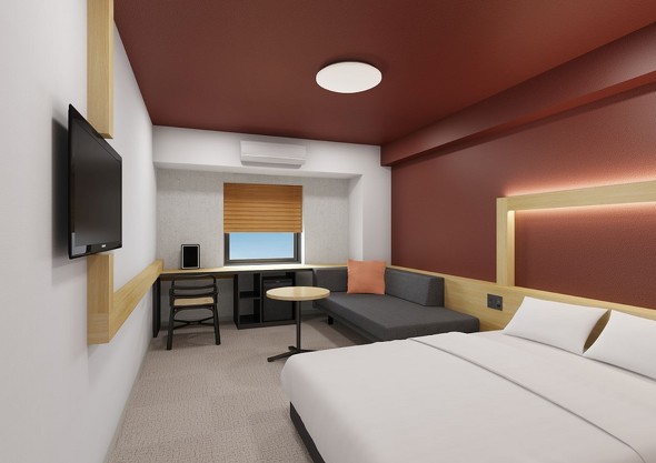 客室は全237室。木目調デザインの間接照明やブラインドで落ち着いた雰囲気を演出するほか、全ての客室にベッドとしても活用できるソファを用意した。