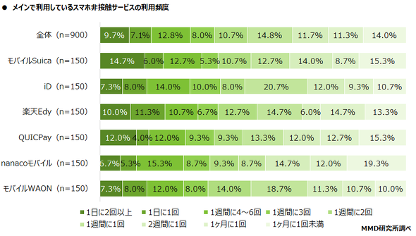 MMD研究所は各サービスの利用者に、利用頻度も聞いた。「iD」と「モバイルWAON」は68.0%が「1週間に1回以上利用する」と答え、その割合が最多だった。他サービスの結果は、「楽天Edy」(66.0%)、「モバイルSuica」(62.0%)、「QUICPay」(60.0%)、「nanacoモバイル」(54.0%)だった。