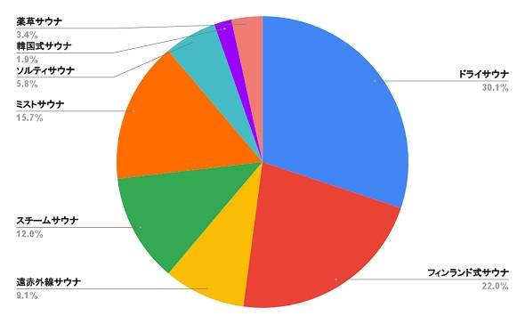 好きなサウナの種類は何かの問いに、1位は「ドライサウナ」(30.1%)、2位は「フィンランド式サウナ」(22.0%)、3位は「ミストサウナ」(15.7%)だった。他にも「スチームサウナ」「遠赤外線サウナ」「ソルティサウナ」「韓国式サウナ」など、多くの種類のサウナに票が投じられた。