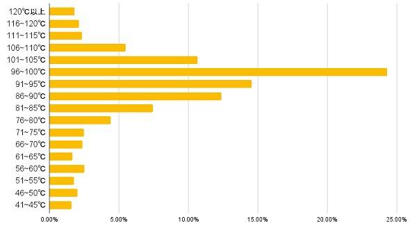 好きなサウナの温度で最も多かったのは、「96〜100度」(24.3%)、次いで「91〜95度」(14.5%)、「86〜90度」(12.3%)だった。好きな水風呂の温度は、「14〜17度」が最も多く33.3%、次いで「18〜20度」が28.7%、「21度以上」が26.4%となった。