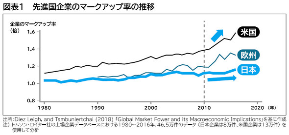 図表1は、欧米と日本のマークアップ率の推移です。