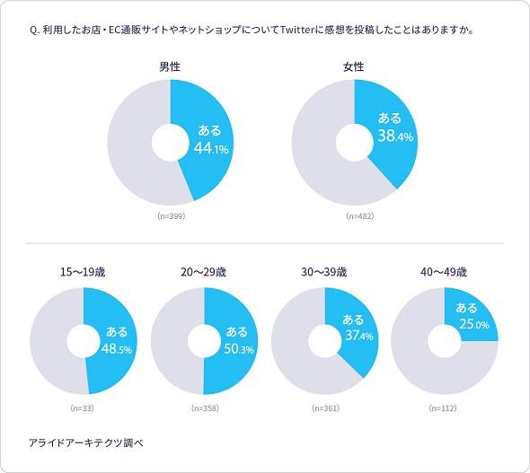 お店・EC通販サイト・ネットショップの感想の投稿経験については、41.0%が投稿したことが「ある」と答えた。男女別では、男性44.1%、女性38.4%と、こちらも男性の方が女性よりも6ポイントほど多い結果となった。