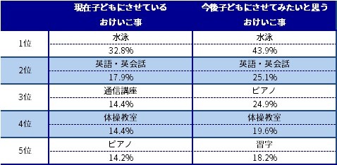 また人気の習い事については、「現在習わせている」、「今後習わせてみたい」ともに、水泳が1位となった。水泳は13年の第1回調査から毎回トップにランクインしている。