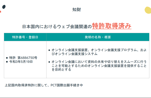 やはり武器が必要だと思っています。これまでコツコツとやってきた部分なのですが、特許を取得しています。双方向翻訳は既に特許を取っています。ほかにも、画面共有を一度に3人でできるマルチ画面共有も特許が取れました。Web会議の世界では特許を取れていない企業がほとんどです。