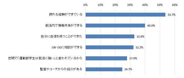 理由は、「誇れる経験ができている」(53.7%)が最も多く、「部活内で情報共有ができる」(40.0%)、「自分に自信を持つことができた」(32.8%)と続いた。「OB・OGに相談ができる」(32.2%)も4位にランクインした。