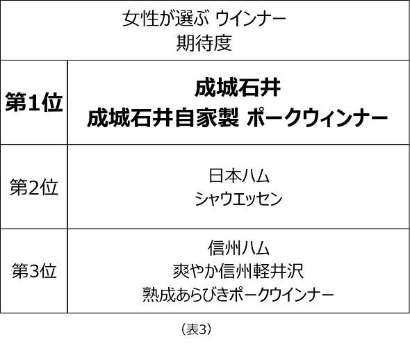 「利用率」では「日本ハム シャウエッセン」が、「期待度」では「成城石井 成城石井自家製 ポークウィンナー」がそれぞれ第1位を獲得した。