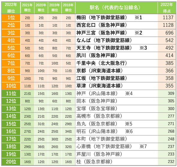 4位以下は「なんば駅」(地下鉄御堂筋線)、「天王寺駅」(地下鉄御堂筋線)、「夙川駅(しゅくがわえき)」(阪急神戸線)と続いた。