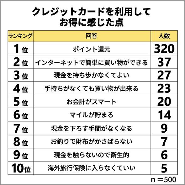 クレジットカード利用者に、「カードを利用して得に感じた点」を聞いたところ、1位は「ポイント還元」(320人)、2位は「インターネットで簡単に買い物ができる」(37人)、3位は「現金を持ち歩かなくてもよい」(27人)だった。