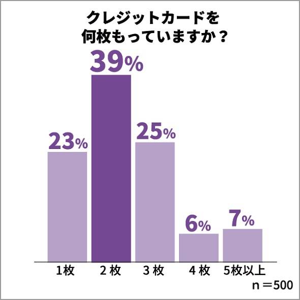 クレジットカードの保有枚数を聞いた。最も多かったのは「2枚」で39%、次いで「3枚」が25%だった。7割以上がクレジットカードを複数枚持っていることが分かった。