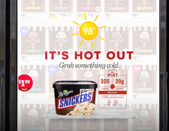 冷凍棚や冷蔵棚の大きな扉を利用して、メーカーの商品を扉全体に表示させるなど、感情訴求型の広告を表示できます。例えば、アイスクリームが陳列されている冷凍棚では、外気温に合わせたプロモーションもできます。