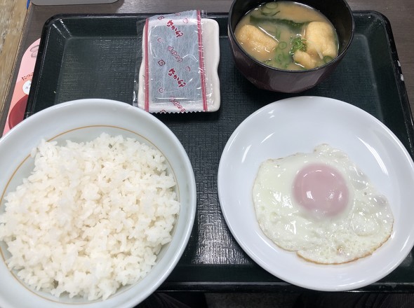 具体的に、「朝定食」は目玉焼きにごはん、海苔、みそ汁が付いた「目玉焼き朝定食」(250円)。こだわり卵(生卵)、ごはん、海苔、みそ汁で構成された「生たまご朝定食」(250円)。納豆、こだわり卵、ごはん、海苔、みそ汁の「納豆朝定食」(310円)。銀鮭にごはん、海苔、みそ汁が付いた「銀鮭朝定食」(370円)となっている。