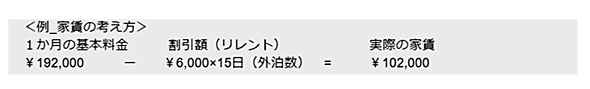 気になる「お金」の仕組みは、こうなっている。例えば、家賃が19万2000円で、割引額が6000円×15日(外泊日数)とすると、実際の家賃は月10万2000円となるのだ(共益費8000円と水光熱費+WiFi使用料1万5000円/月は別)。