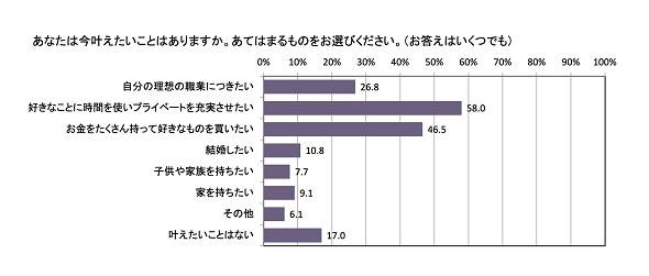 新成人の83.0%が「今叶えたいことはある」と回答。2位は「お金をたくさん持って好きなものを買いたい」(46.5%)、3位は「自分の理想の職業につきたい」(26.8%)だった。