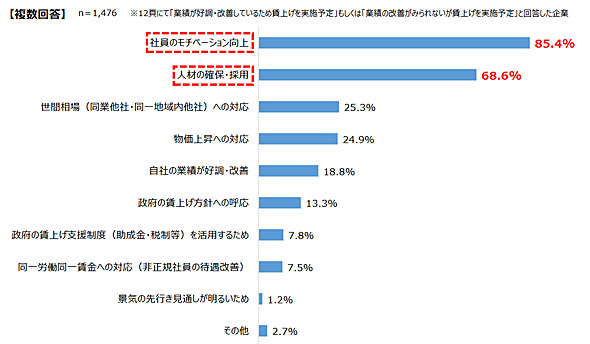 「賃上げを実施予定」と答えた企業に、その理由を尋ねたところ「社員のモチベーション向上」(85.4%)や「人材の確保・採用」(68.6%)が目立った。このほか「世間相場(同業他社・同一地域内他社」(25.3%)、「物価上昇への対応」(24.9%)、「自社の業績が好調・改善」(18.8%)と続いた。