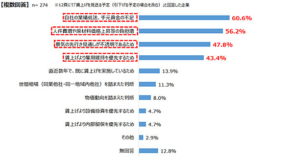 一方、「賃上げを見送る予定」と答えた企業(8.5%)にも、その理由を聞いたところ「自社の業績低迷、手元資金の不足」(60.6%)がトップ。次いで「人件費増や原材料価格上昇等の負担増」(56.2%)、「景気の先行き見通しが不透明であるため」(47.8%)、「賃上げより雇用維持を優先するため」(43.4%)と答えた企業が多かった。