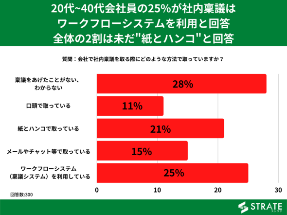 「社内稟議を取る際にどのような方法で取っていますか?」という質問に対し、稟議をあげたことがある人の中では「ワークフローシステム(稟議システム)を利用している」(25%)と回答した人が最も多かった。次いで「紙とハンコで取っている」(21%)、「メールやチャットなどで取っている」(15%)という結果に。28%は「稟議をあげたことがない、分からない」との回答だった。