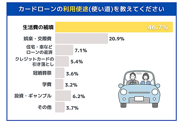 カードローンの使い道については「生活費の補てん」(46.7%)が断トツ。このほか「娯楽・交際費」(20.9%)、「住宅・車などローンの返済」(7.1%)、「クレジットカードの引き落とし」(5.4%)を挙げた人も。