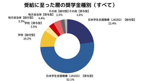 実際に利用した奨学金種別は、1位は「日本学生支援機構(JASSO)【貸与型】」が52.1%、2位は「日本学生支援機構(JASSO)【給付型】」で22.4%だった。「学校【給付型】」は10.2%だった。運営団体数の多い「財団法人」や「地方自治体」などの奨学金は5%以下の利用という結果だった。