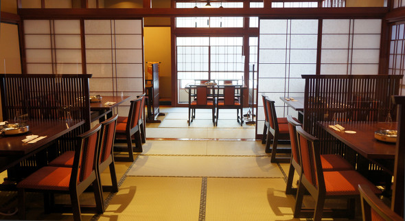店内は着物の帯、日本庭園を意識した石など、日本人なら間違いなくノスタルジーを感じる雰囲気を作り上げた。一方で、座椅子がある和室もあれば、立ち上がるのが大変な客を意識して普通のテーブル席を畳の大部屋に設置するなど、あくまでも客目線での座席配置を考えている。