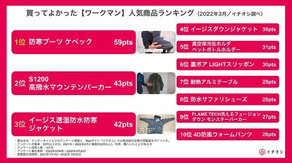 以降は6位「裏ボア LIGHTスリッポン」(30ポイント)、7位「耐熱アルミテーブル」(29ポイント)、8位「防水サファリシューズ」(28ポイント)、9位「FLAME TECH 洗えるフュージョンダウン モンスターパーカ」(27ポイント)、10位「4D防風ウォームパンツ」(26ポイント)となっている。