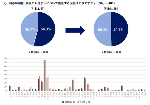コロナ禍で引っ越しをした人に居住エリアの変化を聞いたところ、都市部の人は54.3%から49.7%、郊外の人は45.7%から50.3%と、郊外居住者の割合がやや増えていた。一方、東京都における引っ越し前後の増減はプラスマイナス0%と変化がなかった。