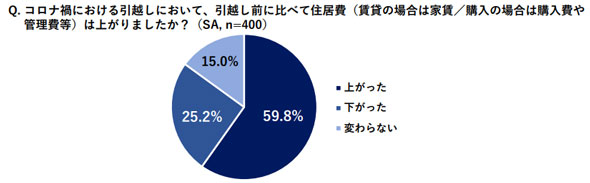 住居費については、引っ越し前後で「上がった」人が59.8%、「下がった」人が25.2%。15.0%は「変わらない」と回答した。郊外や地方への移住は微増だったものの、住居費に関してはよりお金をかける人が多くなっているようだ。