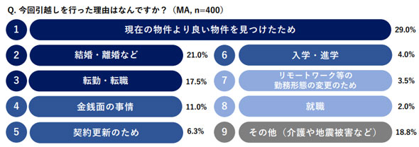 引っ越しの理由は、「現在よりもより良い物件を見つけた」が29.0%、「結婚・離婚など」が21.0%、「転勤・転職」が17.5%など、一般的な理由が上位を占め、新型コロナウイルスの感染拡大が引っ越し理由や物件選びにあまり大きな影響を与えていないことが分かった。