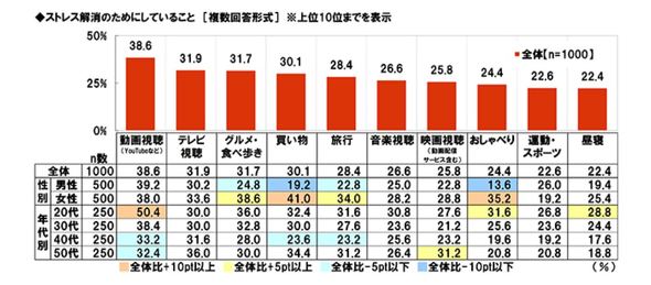 大和ネクスト銀行の調査によると、ビジネスパーソンがストレス解消のためにしていることとして、最も多いのは「動画視聴 (YouTubeなど)」で38.6%だった。