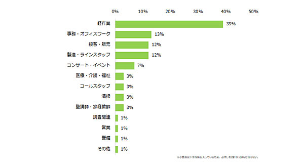 登録制バイトを経験したことがある人に、初めて応募したときの職種を聞いたところ、トップは「軽作業」(39%)。次いで「事務・オフィスワーク」(13%)、「接客・販売」「製造・ラインスタッフ」(いずれも12%)が続いた。