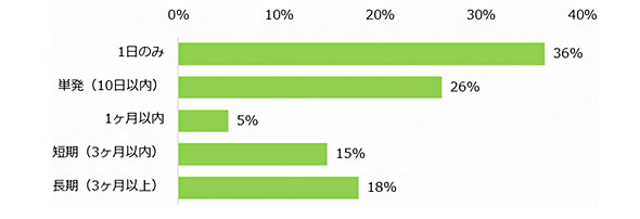 また、初めて応募したときの勤務期間を尋ねると、「1日のみ」(36%)最も多かった。次いで「単発(10日以内)」(26%)、「長期(3カ月以上)」(18%)という結果に。