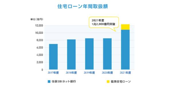 住信SBIネット銀行は4月15日、2021年度の住宅ローン取り扱い額が1兆2000億円を突破したと発表した。住信SBIネット銀行単体では、07年9月の営業開始以来、初の1兆円突破となる。