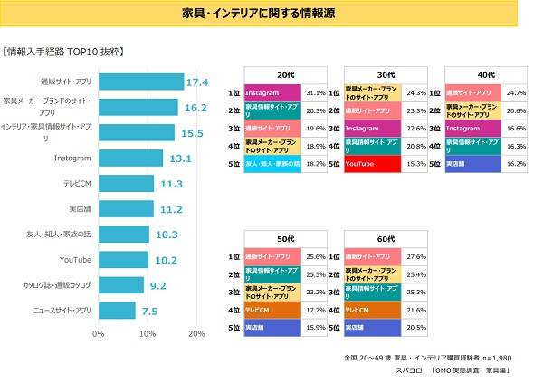 全体で最も多かったのは「通販サイト・アプリ」(17.4%)、次いで僅差で「家具メーカー/ブランドのサイト・アプリ」(16.2%)、「インテリア・家具情報サイト・アプリ」(15.5%)、「テレビCM」(11.3%)、「実店舗」(11.2%)であった。