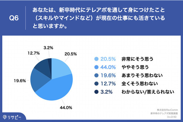 前述の設問で、テレアポ業務が大変だった理由として「今後のキャリアで役に立つか分からなかったから」(17.7%)という回答もあがっていたが、半数以上の人がその後も生きるスキルやマインドを身につけたことが分かる。