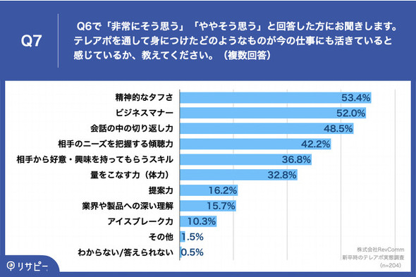 テレアポを通して身についたこととしては、精神的なタフさが最も多く53.4%。以下、ビジネスマナー(52.0%)、会話の中の切り返し力(48.5%)、相手のニーズを把握する傾聴力(42.2%)と続いた。