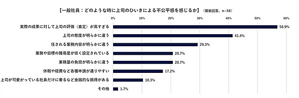 「不公平を感じたことがある」と答えた人に、どのようなときに不公平を感じるか聞いたところ「実際の成果に対して上司の評価(査定)が高すぎる」(56.9%)がトップ。次いで「上司の態度が明らかに違う」(41.4%)、「任される業務内容が明らかに違う」(29.3%)、「業務や目標の難易度が低く設定されている」「業務量の負担が明らかに違う」(いずれも20.7%)と続いた。