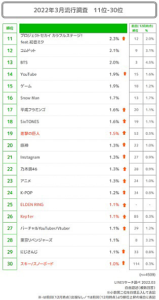 「プロジェクトセカイ カラフルステージ!feat.初音ミク」(2.3%)が11位、「原神」(1.3%)が20位、「ELDEN RING」(1.1%)が25位といったように、ゲームタイトルが多くランクインした。