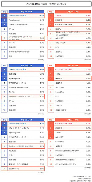 男女・年齢別で分析すると、「ロシアのウクライナ侵攻」はほぼ全てのカテゴリーで1位だった。女性の15〜18歳のみ3位だった。
